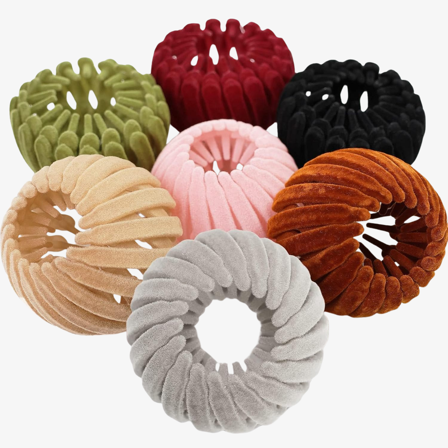 A set of 7 colorful expandable ponytail holders designed with a unique bird nest style, offering strong flexibility, durability, and easy everyday use.