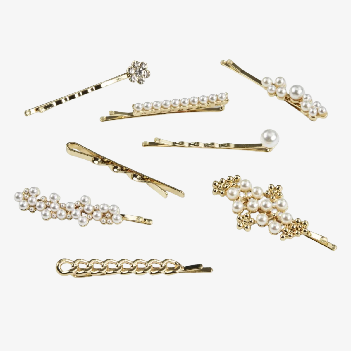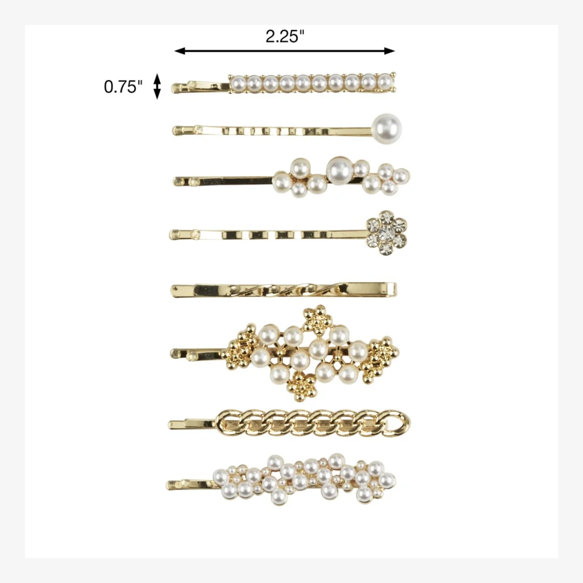 An 8-pack of stylish gold bobby pins with faux crystal and pearl accents, designed to give you a chic look at an affordable price.