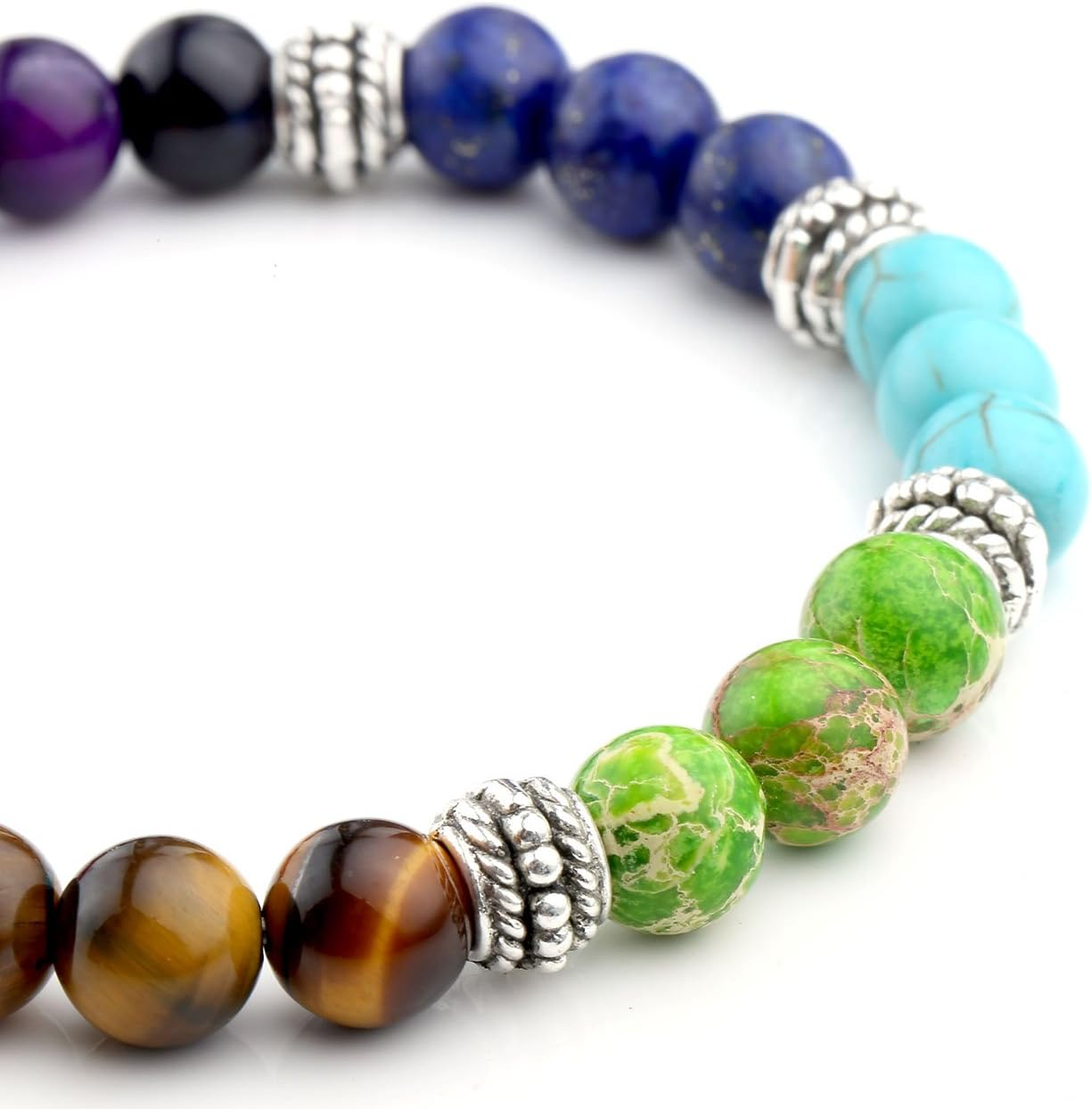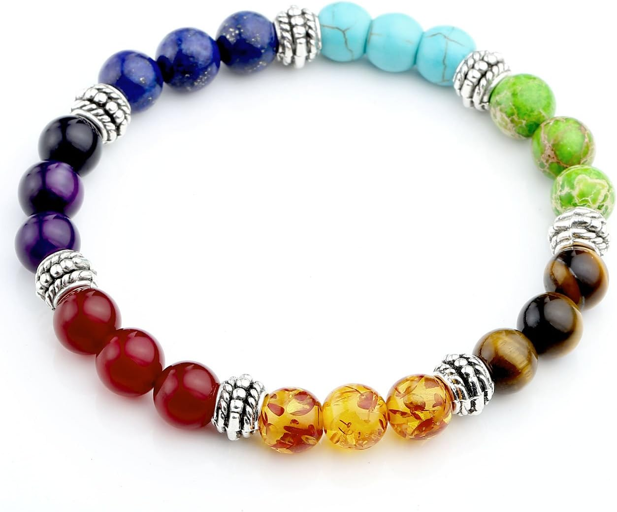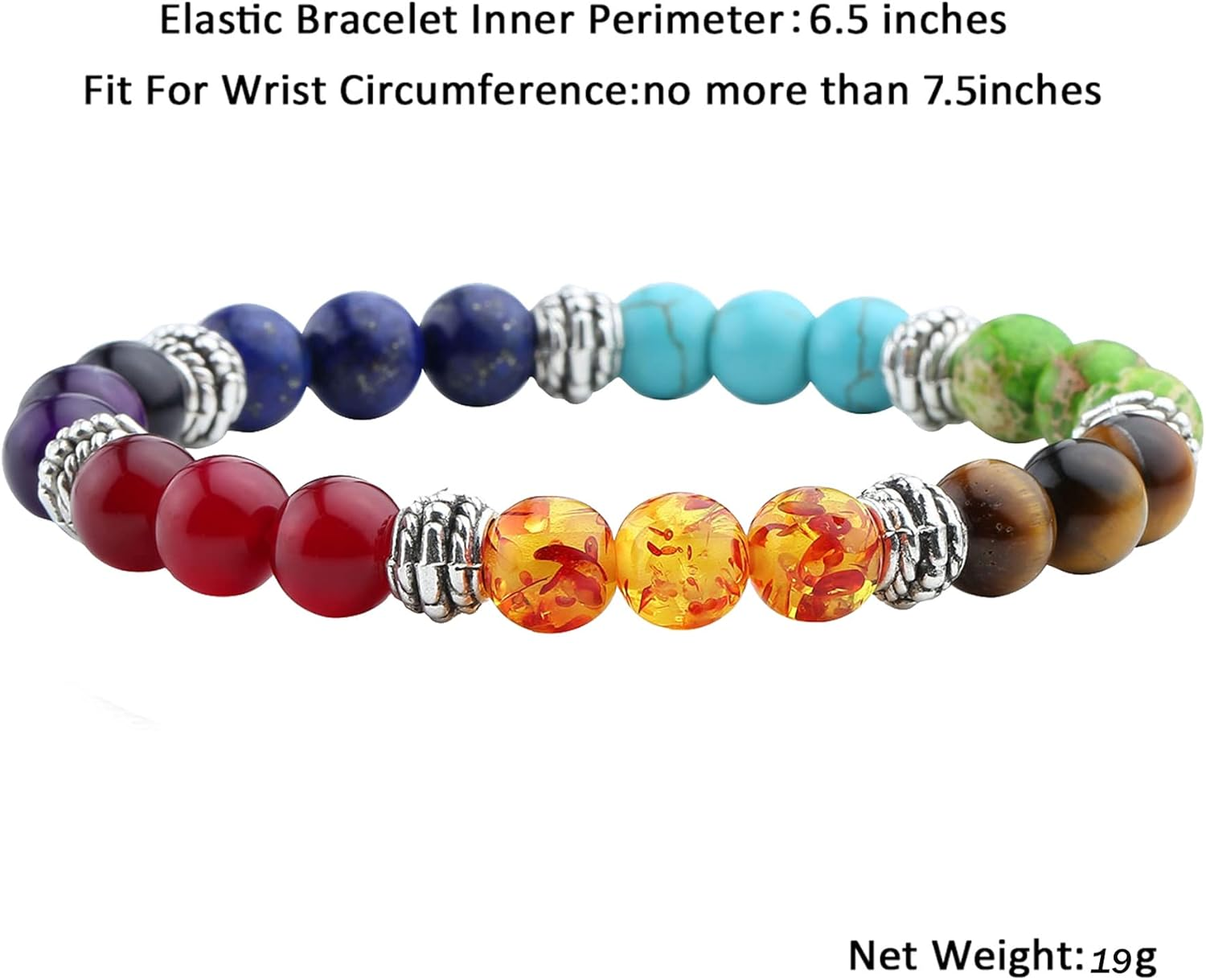 A 7 chakra bracelet made with 8mm natural gemstone beads on an elastic cord, designed for reiki healing and energy balancing. This high-quality bracelet helps ease emotional stress and promote spiritual well-being for both men and women.
