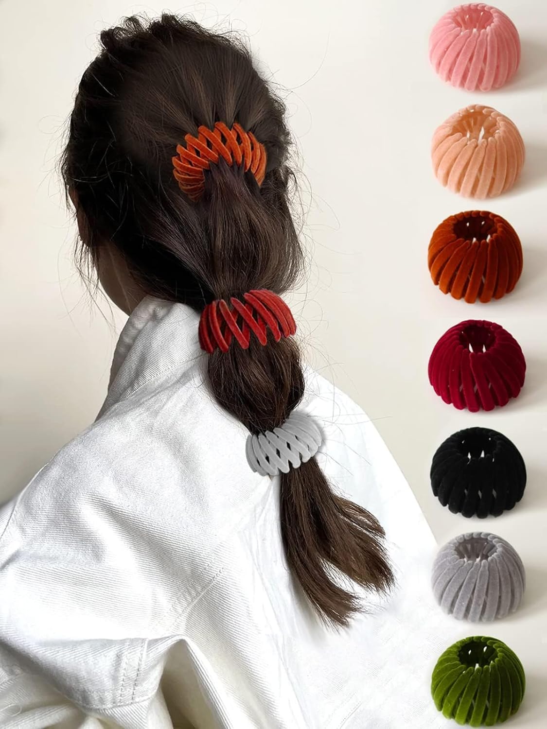 A set of 7 velvet birds nest hair clips in multiple colors, designed for creating neat and elegant hairstyles. With an adjustable inner diameter from 1.0 to 3.5 inches, these flexible clips are perfect for various hair types and occasions, from daily wear to special events.