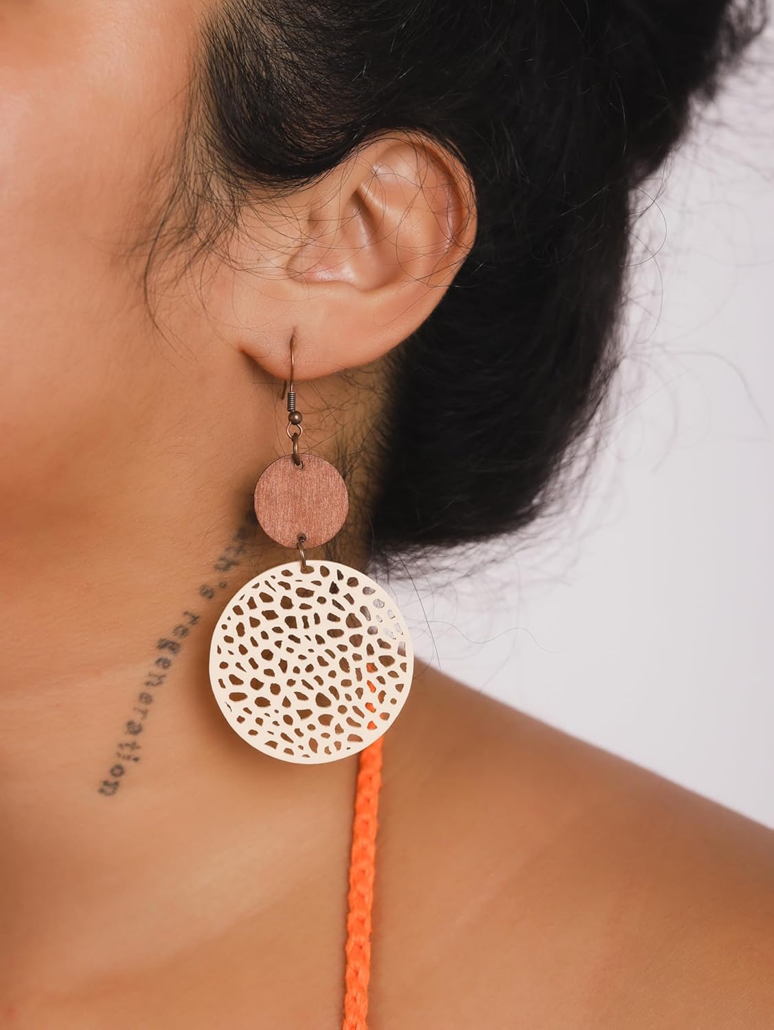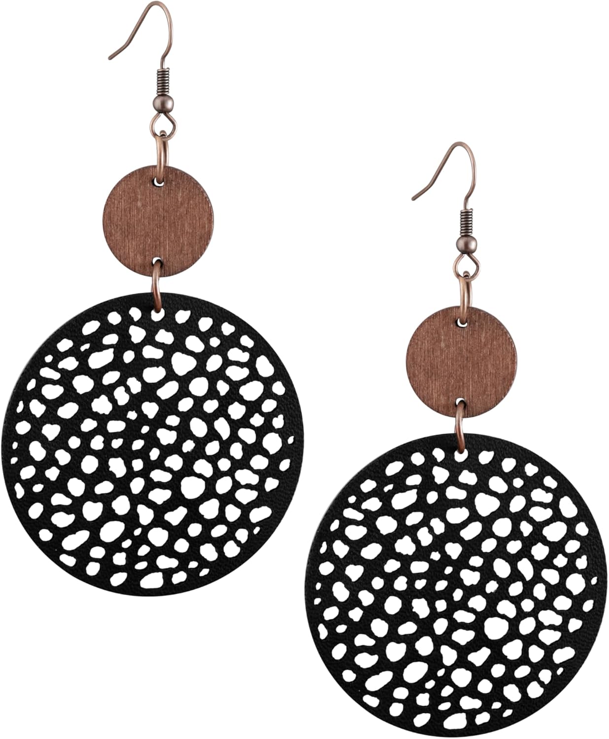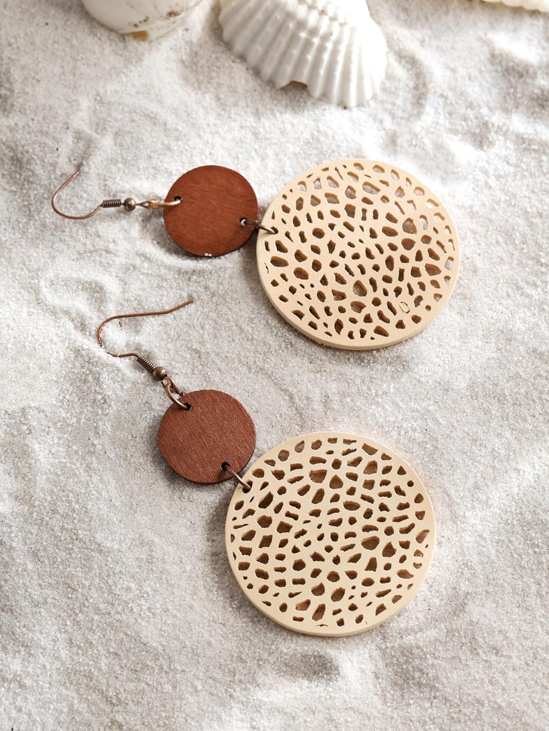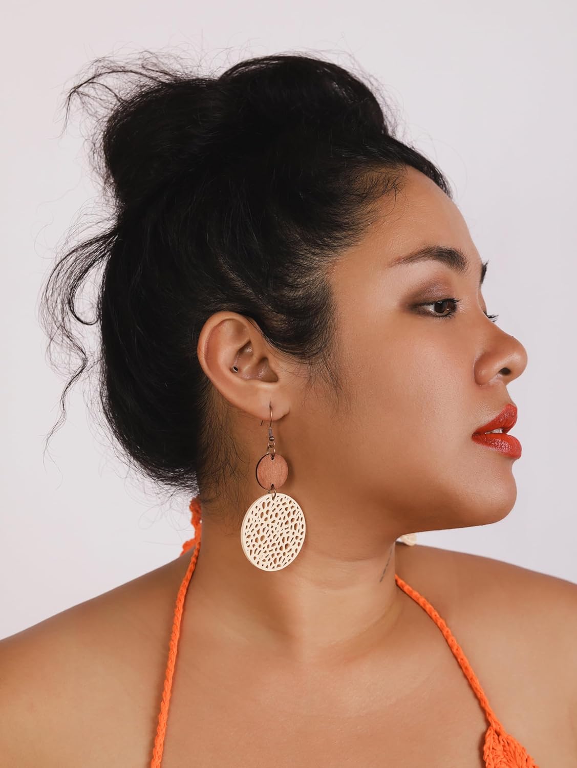 Bohemian hollow cut-out dangle earrings crafted from sustainably sourced wood and leather. These featherlight earrings feature intricate artistry with a subtle boho flair, offering a versatile and eco-friendly fashion statement for any event.