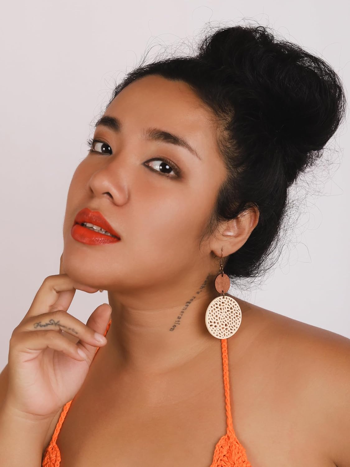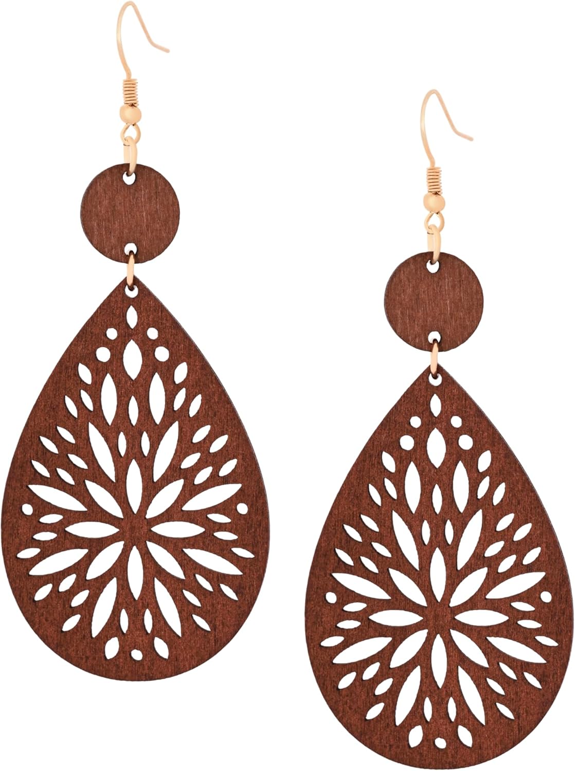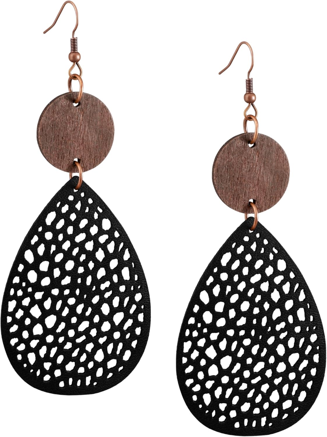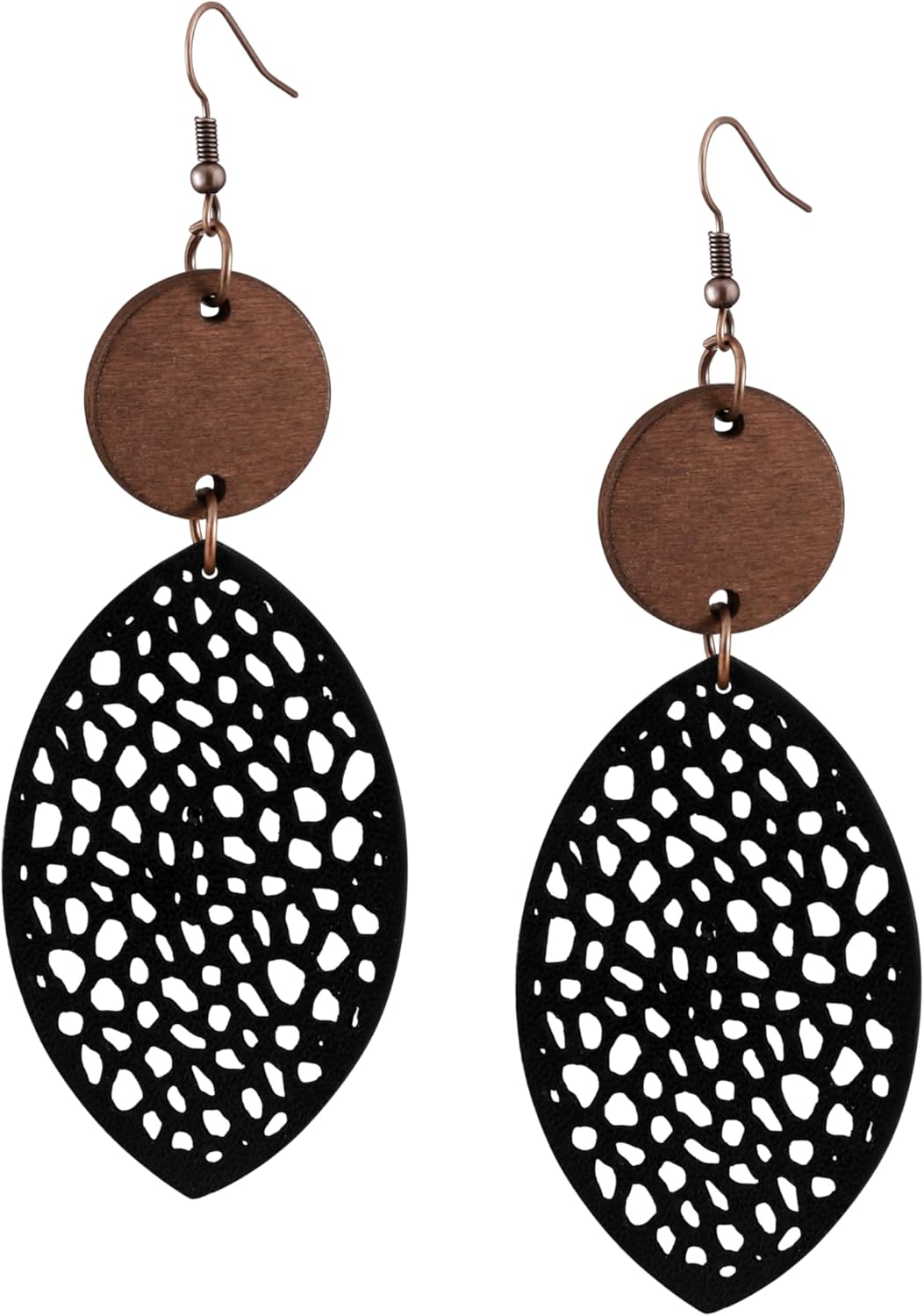 Bohemian hollow cut-out dangle earrings crafted from sustainably sourced wood and leather. These featherlight earrings feature intricate artistry with a subtle boho flair, offering a versatile and eco-friendly fashion statement for any event.