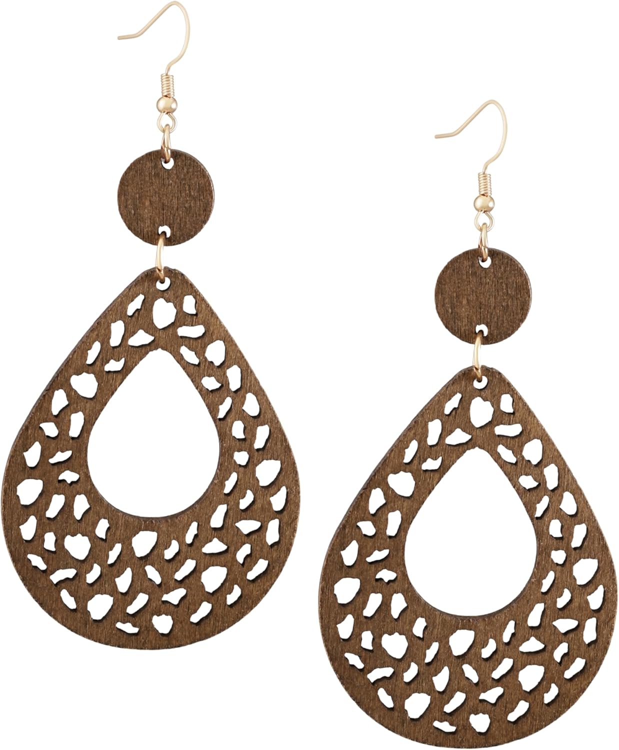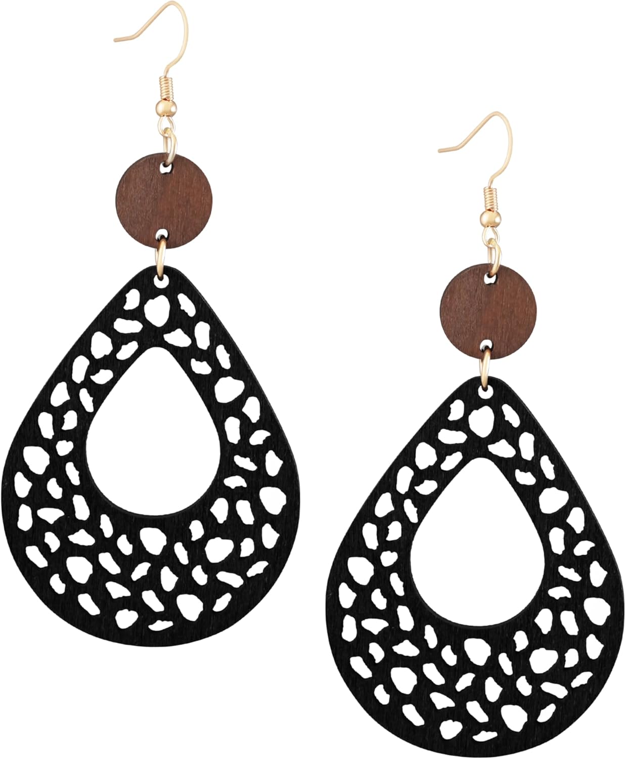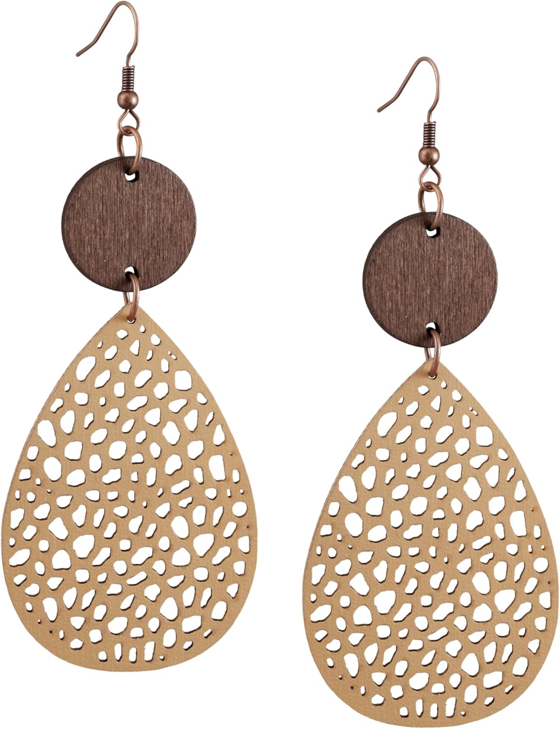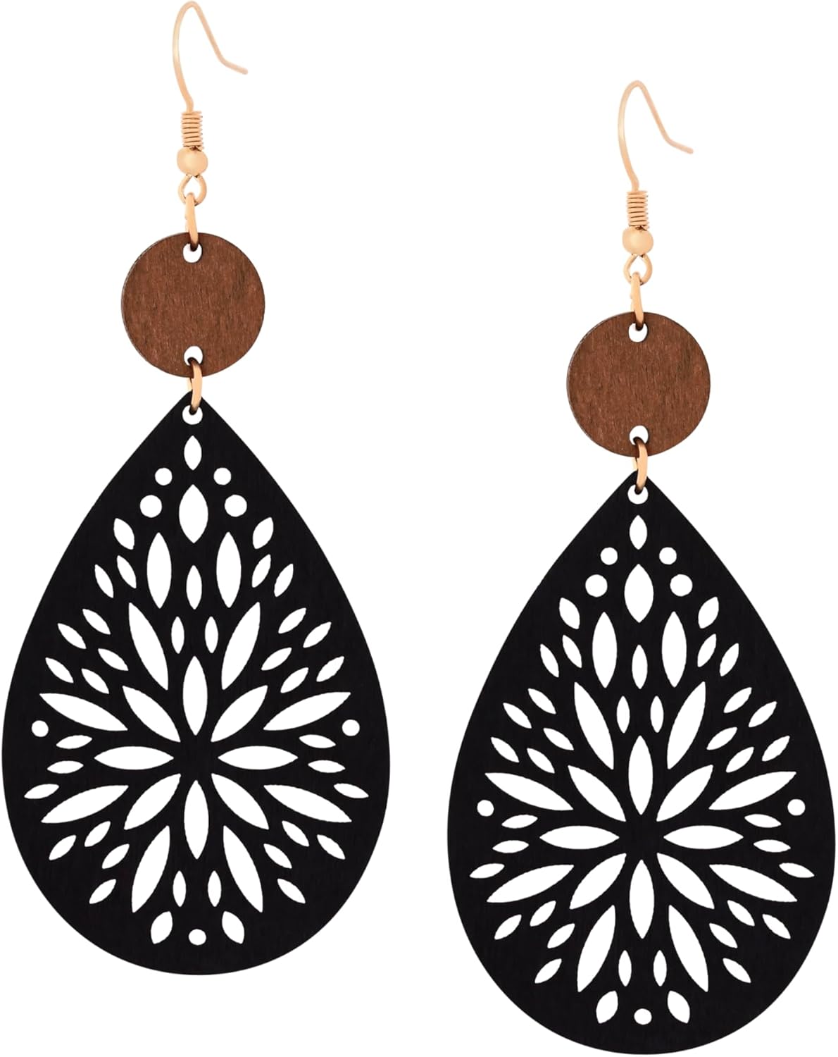 Bohemian hollow cut-out dangle earrings crafted from sustainably sourced wood and leather. These featherlight earrings feature intricate artistry with a subtle boho flair, offering a versatile and eco-friendly fashion statement for any event.