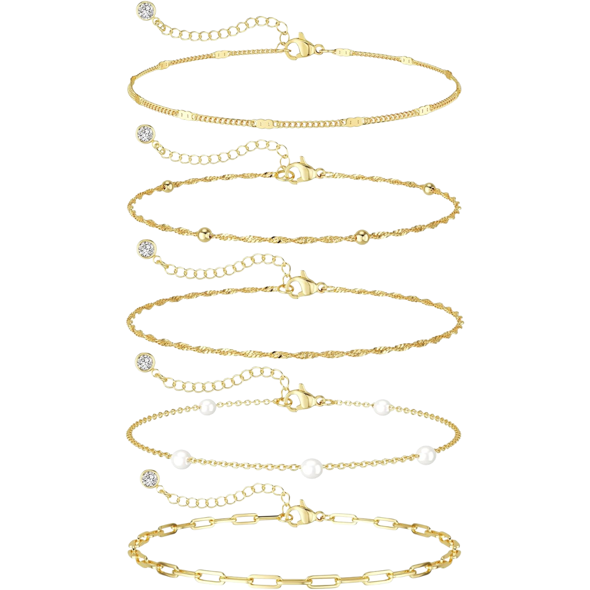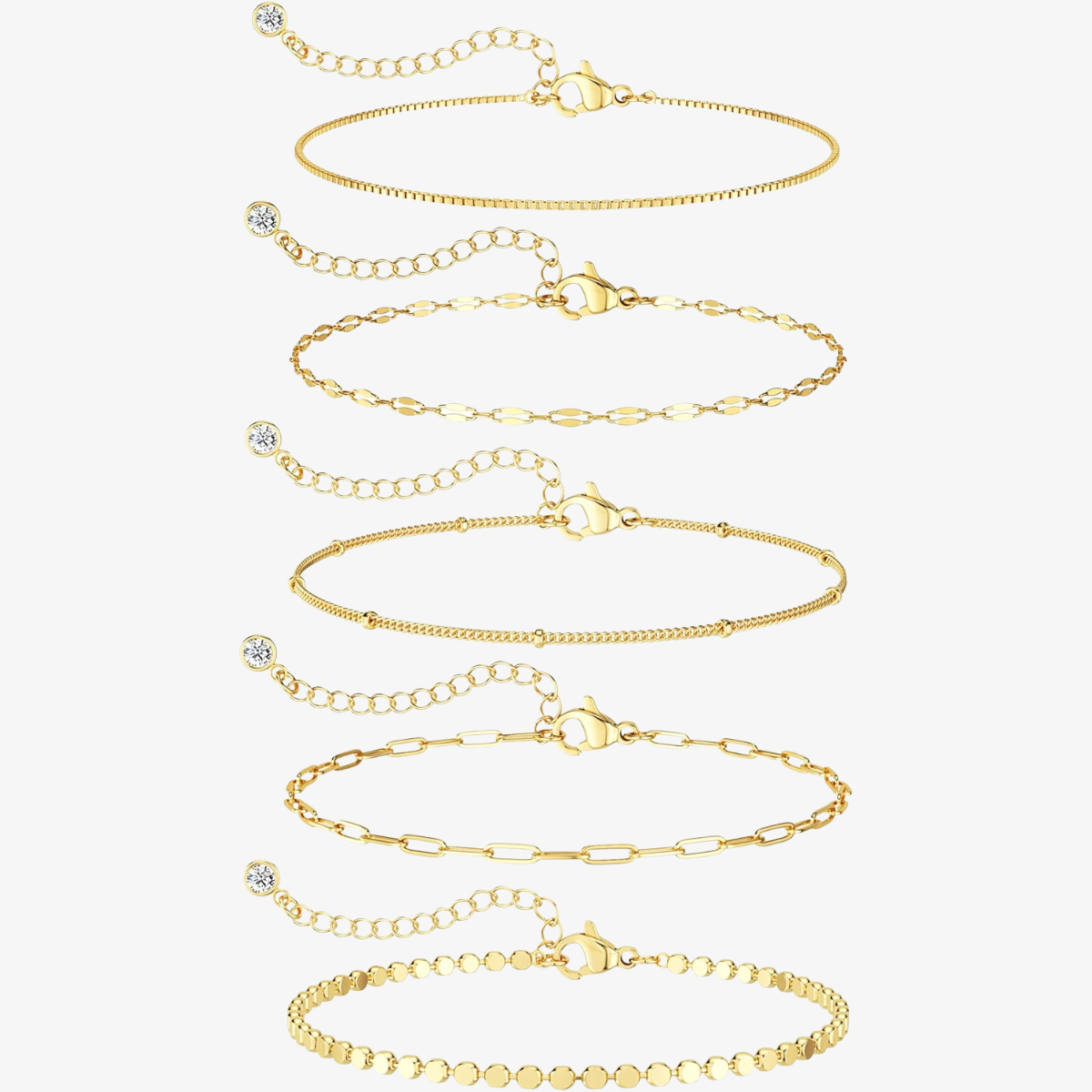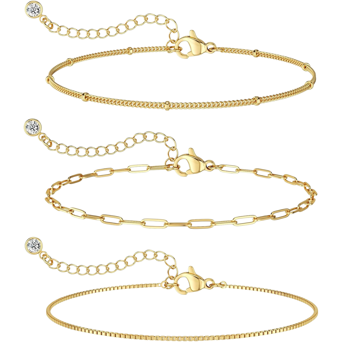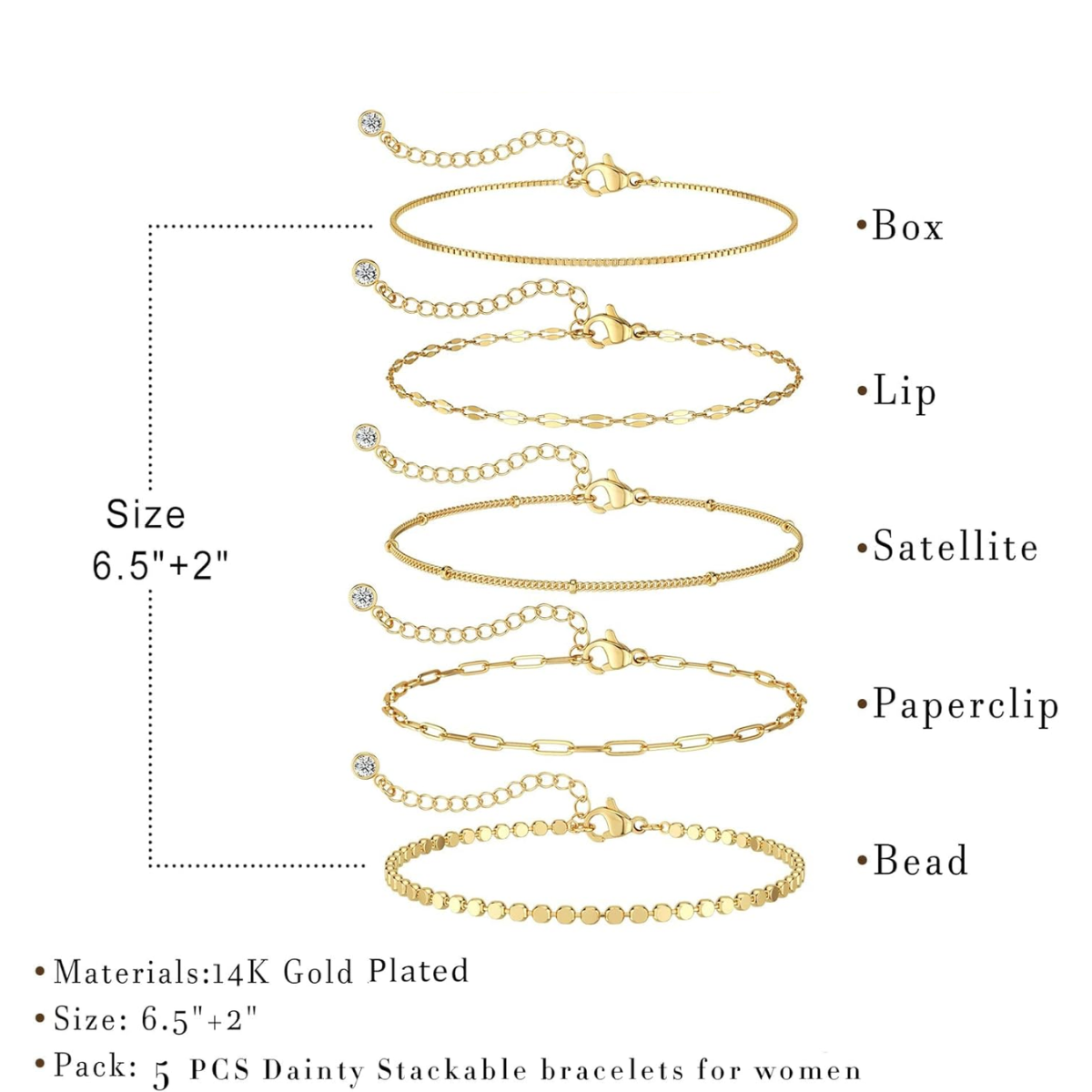 A trendy and dainty bracelet stack featuring 14K gold plated beaded and paperclip chain bracelets. This waterproof jewelry set is designed for versatile styling, offering a thin, delicate look perfect for everyday wear and gifting.