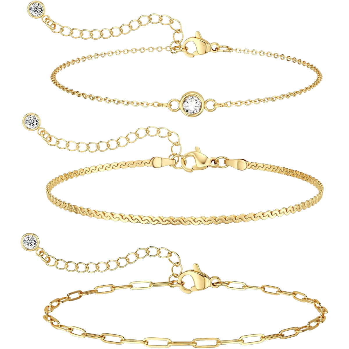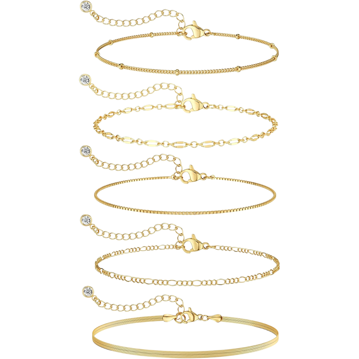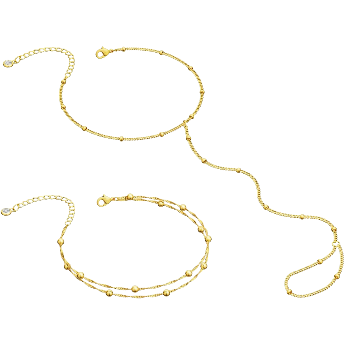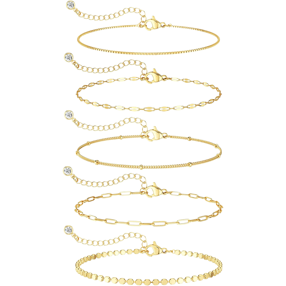 A trendy and dainty bracelet stack featuring 14K gold plated beaded and paperclip chain bracelets. This waterproof jewelry set is designed for versatile styling, offering a thin, delicate look perfect for everyday wear and gifting.