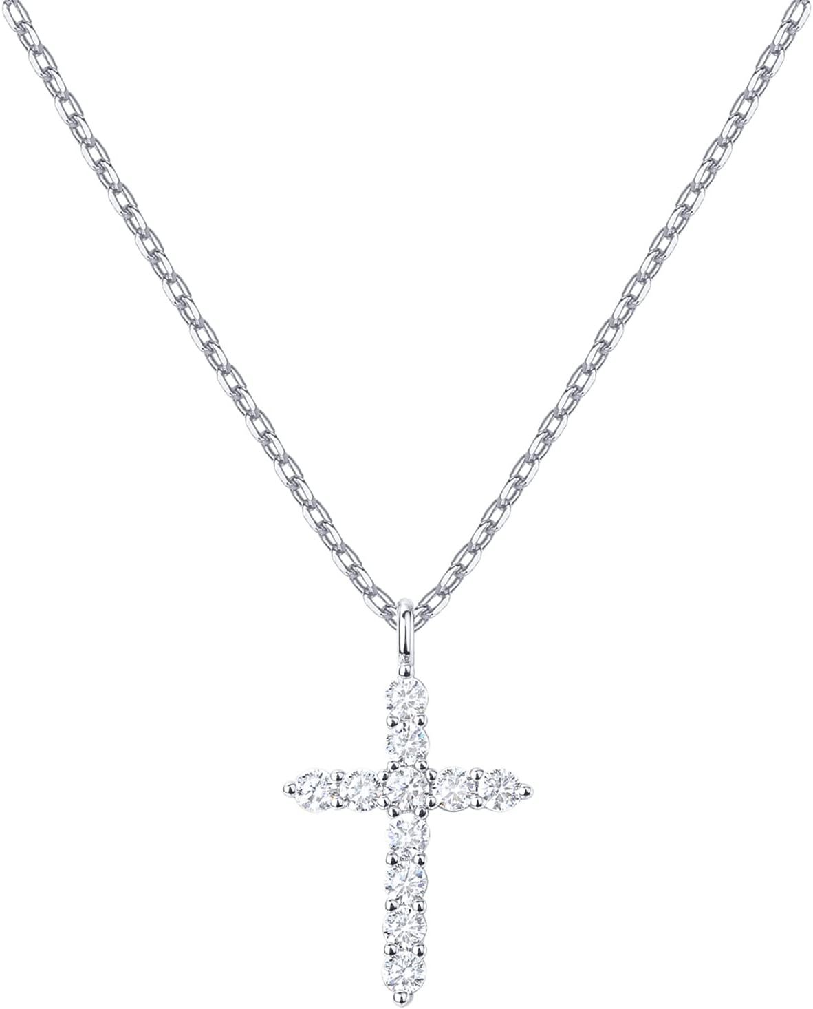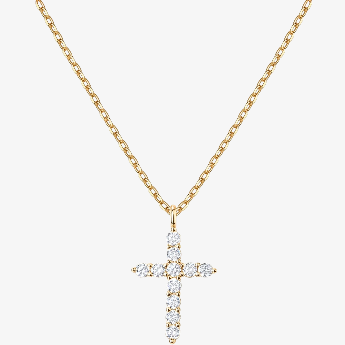 A women's cross-shaped faith necklace crafted from hand-selected AAAAA-quality cubic zirconia and plated in 14K yellow gold. Featuring a 19-inch sliding chain and sustainable materials, this hypoallergenic necklace makes a meaningful, eco-conscious gift for special occasions.