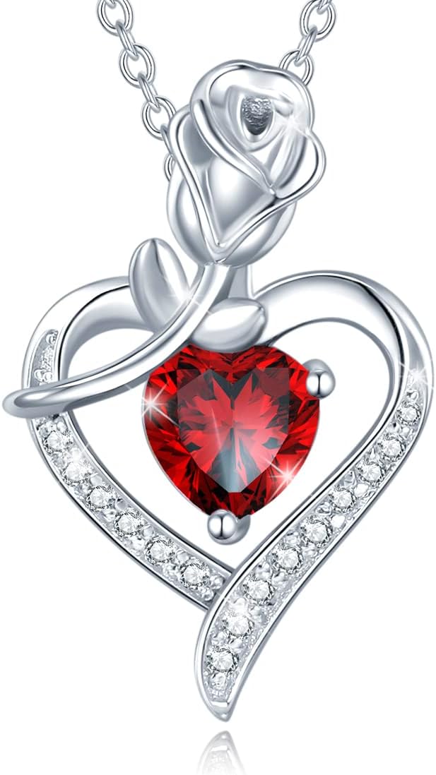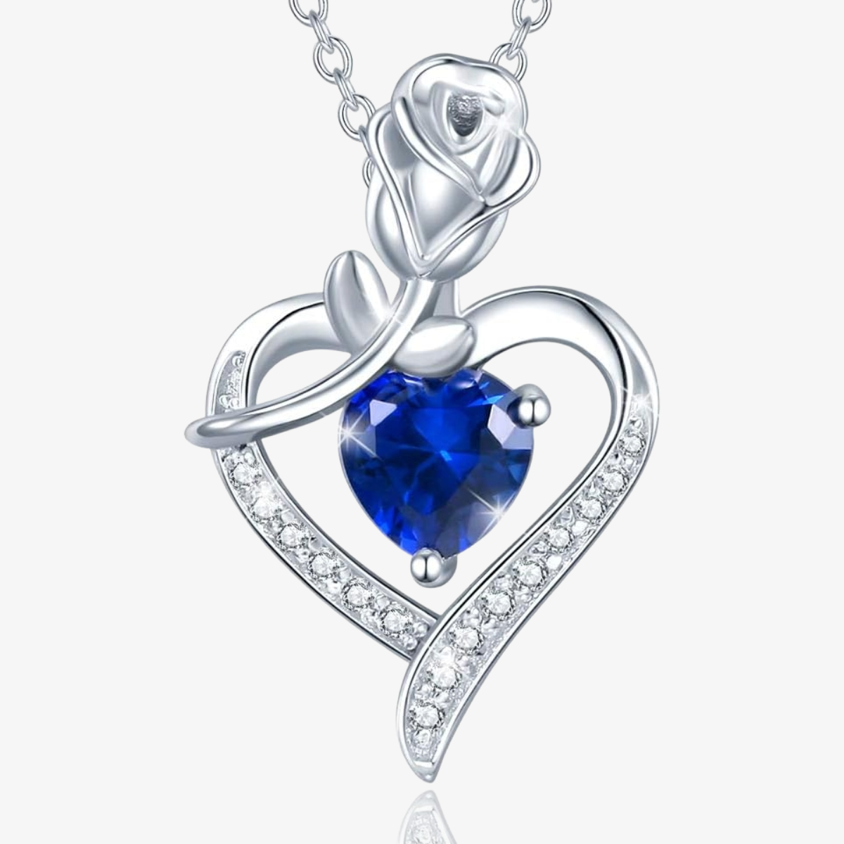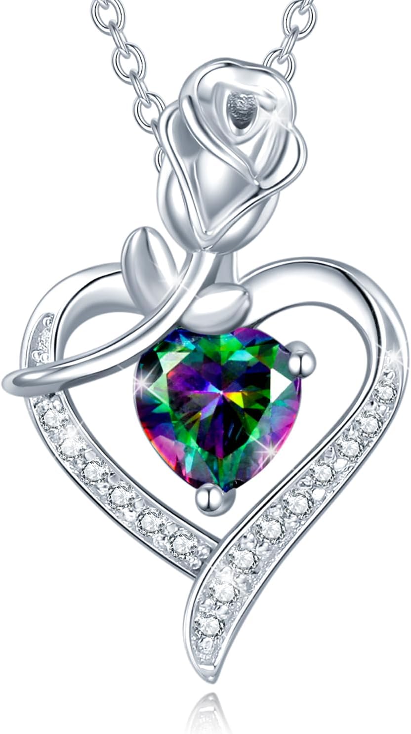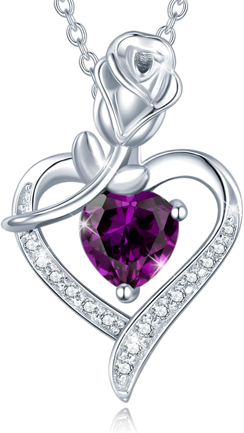 A romantic rose flower heart pendant necklace crafted from 925 sterling silver with customizable birthstone selections. This elegant piece embodies romantic elegance with a dream-like design, perfect for women who cherish meaningful jewelry gifts.
